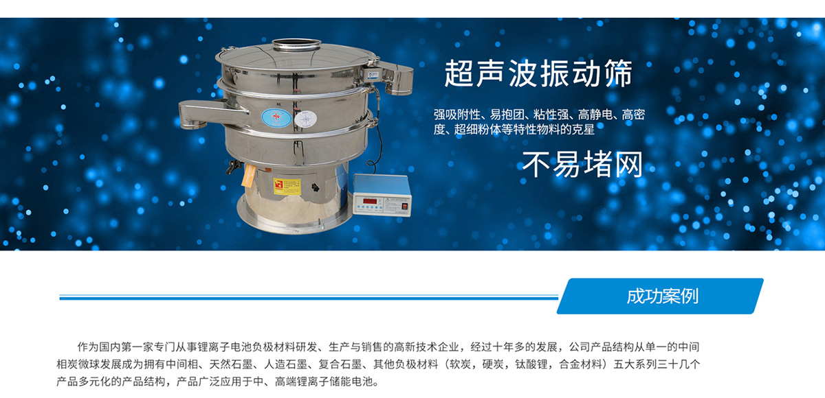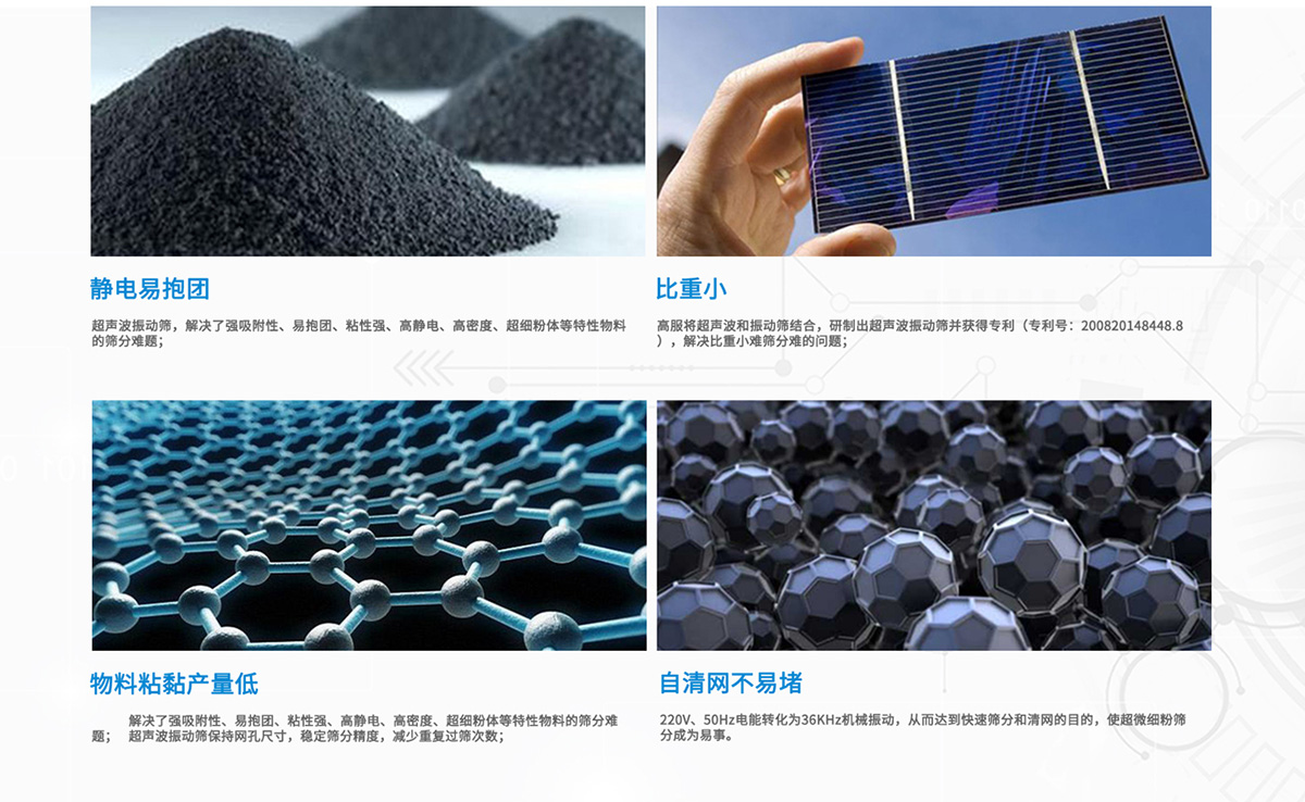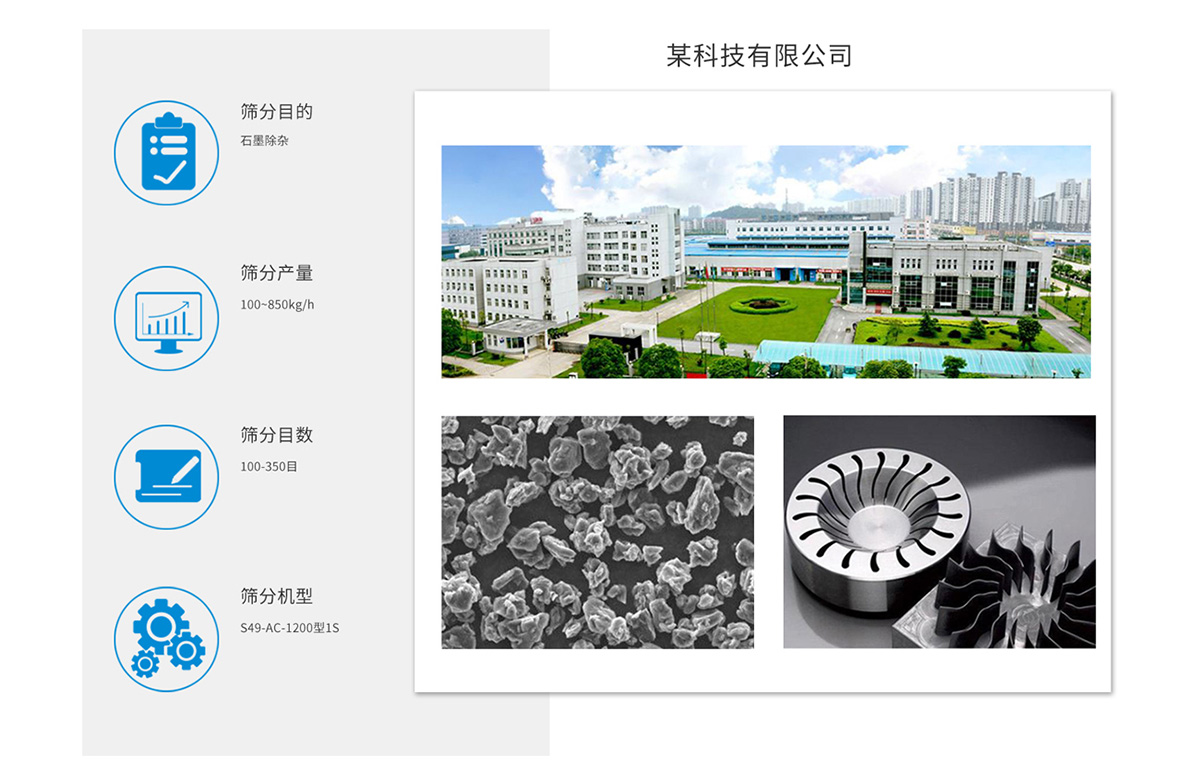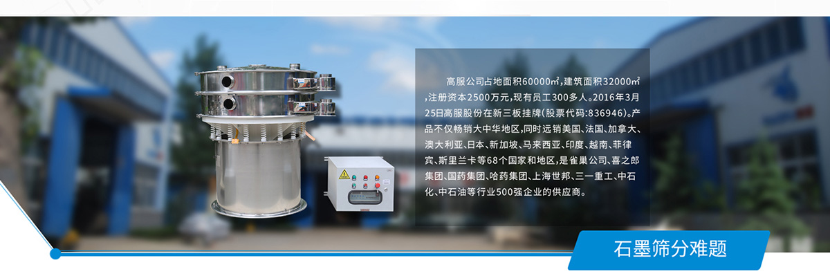 石墨筛分方案 石墨粉分筛机筛分难题比重较轻0.3-0.8,粒度细D90在20微米以下,易抱团,流动性较好,高服石墨过筛机可以解决筛分产量无法扩大的问题。
