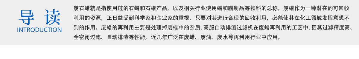 废蜡过滤方案 废蜡过滤机又称废蜡脱色过滤机主要是废蜡的再利用处理掉废蜡中的杂质,高服自动排渣过滤机在废蜡再利用的工艺中,因其过滤精度高、全密闭过滤、自动排渣等性能!