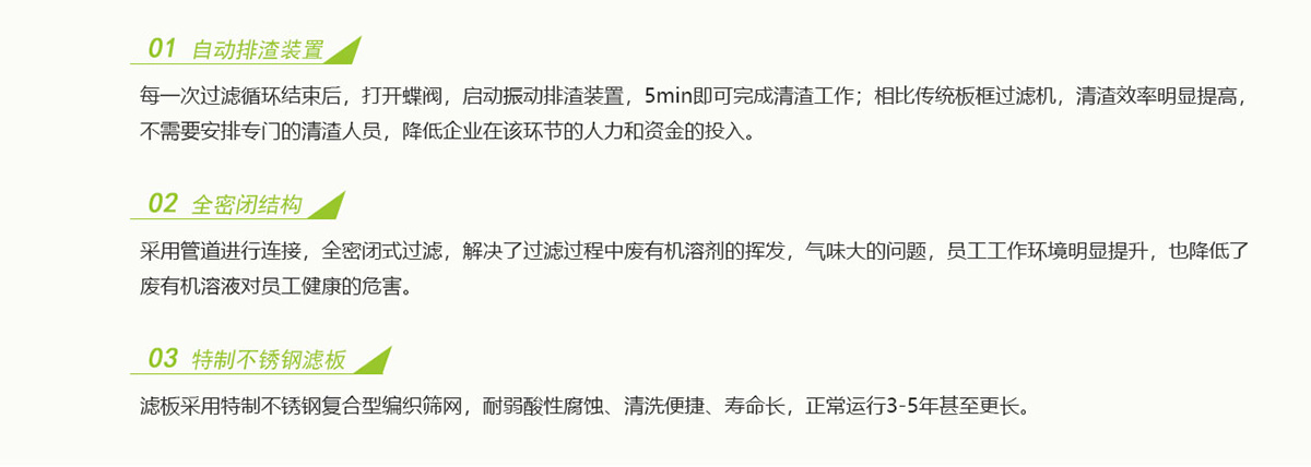 废有机溶剂过滤方案 废溶剂过滤机又称废溶剂脱色过滤机采用管道进行连接,全密闭式过滤,解决了过滤过程中废有机溶剂的挥发,废有机溶剂过滤设备的滤板采用特制不锈钢复合型编织筛网,耐酸性腐蚀,寿命长!