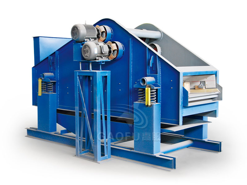 脱水振动筛采用双电极自同步技术,通用型偏心块、可调振幅振动器。主要由筛箱、激振器、支承系统及电机组成。通过胶带联轴分别驱动两个互不联系的振动器作同步反向运转,两组偏心质量产生的离心力沿振动方向的分力叠加,反向离心抵消,从而形成单一的沿振动方向的激振动,使筛箱做作往复直线运动。